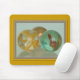 Drei verglaste Marmor sind in Gold gerahmt, mit einer grauen "Matte". Marmor ist klar mit orangefarbenem Swirl, massivem "Kupfer" und blau getöntem Glas mit orangefarbenem Globul in der Mitte.
