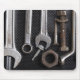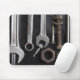 Mauspad mit Foto von Werkzeugen eines Mechanikers (Nuss, Nuss, Schrauben) auf einer reflektierenden Oberfläche aus Kohlenstofffasern