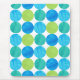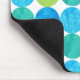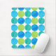 Ein lebendiges Mousepad mit einem abstrakten "Blue Moons"-Muster in heller Blues und Neon-Grün auf weißem Hintergrund; von Judy Adamson, einem handbemalten Collage-Design.
