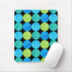 Ein lebendiges Mousepad mit einem abstrakten "Blue Moons"-Muster in heller Blues und Neon-Grün auf schwarzem Hintergrund; von Judy Adamson, einem handbemalten Collage-Design.