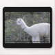 Das Bild ist in einem schwarzen Fenster gerahmt. Die Quadrate werden in Ecken mit einer Linie eingezogen, die die simulierte Mattierung des Rahmens markiert. Weißes Alpaca stehend vor Bäumen. Ersetzen Sie das Bild, falls gewünscht, durch Ihr eigenes.