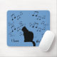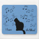 Die Black Cat Silhouette ist von mehreren fliegenden musikalischen Noten umgeben. Anpassen, indem Sie den blauen Hintergrund in eine Farbe Ihrer Wahl ändern.