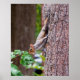 Photo of a gray squirrel clinging to a tree with a nut stuffed in his mouth