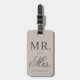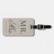 Ein modernes Gepäckanhänger mit großem Text und Familiennamen unten in einer Mischung aus geschlechtsspezifischen Schriftart. Ideal für frische Weds und Flitterwöchler.
