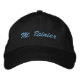 Mt Rainier Cap gezeigt in Schokolade/Blau mit besticktem Text.