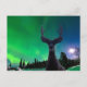 Neugieriger Saumhirsch Odocoileus hemionus starrt in der Kamera während er fotografiert spektakuläre Anzeige der grünen Northern Lights Aurora borealis über mondbeleuchtete boreal forest taiga