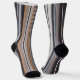 A Pair Of Multi Colored Vertical Lined Unisex Crew Sock In Browns, Black And Gray Colors