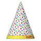 Schöne, bunt gekleidete Bären und gelbes Band mit personalisiertem Text auf weißem Party Hut. Ideal für alle Kinder-Events.