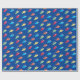 Farbenfrohe, Cartoon, kleine Haie (in Grün, Rot, Blau, Grün und Gelb) mit Weihnachtsmannmützen auf einem blauen, weihnachtlichen Umhüllungspapier.