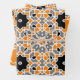 Set aus drei Papierblättern mit unterschiedlichen Mustern in passenden Farben. Jedes Blatt weist ein nahtloses Muster aus geometrischen Formen in Orange, Grau, Schwarz und Weiß auf.