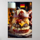 Tauchen Sie ein in ein Münchner Münchner Erlebnis mit diesem köstlichen deutschen Beerhouse Burger. Eine dicke, saftige, bratwurstreiche Rindfleischpartie, gegrillt bis zu einer herzhaften Perfektion, wird mit geschmolzenem Gouda-Käse, tangiger Sauerkraut und einem großzügigen Schmal VollkornSenf geschmeckt. Alle sind zwischen einem gerösteten Brezel-Bun eingebettet. Eine kleine deutsche Fahne sorgt für eine festliche Touch, während ein verschwommener Hintergrund auf einen erfrischenden Bierstein hindeutet, der diese deutsche kulinarische Köstlichkeit vervollständigt.