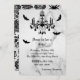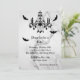 Ein schwarzer Kristallkronleuchter und unheimliche Fledermäuse auf klassischem Marmorboden schmücken das moderne Halloween-Party Invitation. Der Rücken ist mit einem extravaganten Spinnendamasken geschmückt.