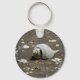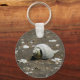 Die Schlüsselkette mit einer beruhigenden Szene einer Muschel auf einem Sandstrand.