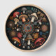 Coole Pilzkunst mit schwarzem Hintergrund. Stilisierte Pilze in konzentrischen Mustern. Volkskunst.