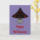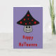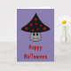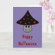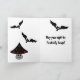 Ein beängstigender Vampir-Cartoon-Pilz, mit einer schwarzen Kappe und roten Flecken, und winzigen Fungenzähnen. Im Inneren befinden sich Vampirschränke. Auf der Vorderseite der Karte steht "Happy Halloween" und im Inneren steht "Möge deine Nacht endgültig pilzartig sein"
