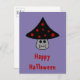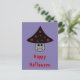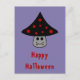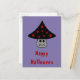 Ein niedlicher Cartoon Pilzvampir auf lila Hintergrund mit "Happy Halloween" in Rot.
