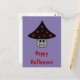 Ein niedlicher Cartoon Pilzvampir auf lila Hintergrund mit "Happy Halloween" in Rot.