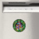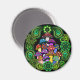 Ein Magnet mit bunten psychedelischen Pilzen, umgeben von grünen Pisley und grünen Mandalasen.