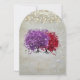Roter Silbergrau und Lila Herzleder Tree Weiße Magische Liebe Zwei Herzlef Bäume auf Tee Geständliches Silbertes Metallic Papier mit einem Overlay antiker Notenblätter und eleganten kleinen Wirblen Designs, um die Wurzeln der Liebe auf dieser einzigartigen Waldwald Woodsy Hochzeitseinladung zu erhöhen. "magische Märchenhochzeit" "lila und silberne Hochzeit" Lila Rote Herzlein Tree Hochzeit Einladungen