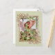 Vintage Kunst mit Märchenmalerei auf eine wunderschöne, mit Kleeblatten bedeckte Fee und mit großen rosa Schmetterlingsflügeln, die eine goldene Harfe spielen, wie kleine Mädchen Feen und Kobobold-Fee mit grünen Mänteln und schwarzen Top-Hüten kreisförmig tanzen.