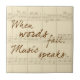 Dieses spricht hübsche Ausrüstungsbeschreibungen das Gefühl, ", wenn Wörter versagen, Musik", über einen Mandel getonten Blattmusik-Blickhintergrund.