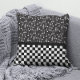 Fun throw Kissen Design hat eine "50er Diner-Atmosphäre mit der oberen Panel von jumbled weißen musikalischen Noten auf schwarzem Hintergrund und ein schwarz-weiß Schachbrettmuster unten Hälfte.