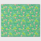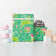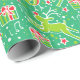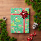 Niedliche Gesangvögel mit rasenden Hirschspänen mit musikalischen Noten, Schnee und Sternen, gemusterte Weihnachtsgeschenkpapier in leuchtend grün, warm rot, weiß und limig grün gelb.