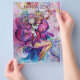 Farbenfrohe, skurrile, lustige, rosa Clownspiele mit einer ausdrucksvollen Eule und fröhlichen musikalischen Noten,Blume,Blätter in lebhaften Rot,Fuchsia,Violett,lila,blau,weiß, Aquarellmalerei von Bulgan Lumini (c)