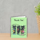 Diese Dankeschön-Karte hat drei schwarze, musikalische Katzen, die in heller Kleidung eine Geige, Gitarre und Saxophon spielen, hinter ihnen reihen sich Musiknoten auf einem hellgrünen Hintergrund. Passen Sie den Dankeschön Text auf der Vorderseite mit der Vorlage an.