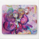 Farbenfrohe, skurrile, lustige, rosa Clownspiele mit einer ausdrucksvollen Eule und fröhlichen musikalischen Noten,Blume,Blätter in lebhaften Rot,Fuchsia,Violett,lila,blau,weiß, Aquarellmalerei von Bulgan Lumini (c)