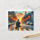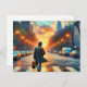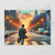 Dieses Bild zeigt ein künstlerisches, farbenfrohes Bild eines Menschen, der bei einem scheinbaren Sonnenuntergang oder Sonnenaufgang eine Straße entlang geht. Der Einzelne ist in der Komposition zentriert, trägt einen langen Mantel und einen Hut, der einen Gitarrenkoffer trägt. Die Straße ist von geparkten Autos gesäumt und von Straßenlampen beleuchtet, und auf beiden Seiten steigen die Gebäude an. Der Himmel strahlt in warmen Farbtönen wie Orange, Gelb und Blau aus, was den Anfang oder das Ende des Tages nahe legt.