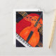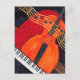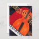 Das musikalische Team und die Noten schweben über einem Cello und Klavier in intensiven Rot und Gold. Die Tastatur unterscheidet sich von den kühnen Farben und dem dunklen Hintergrund.