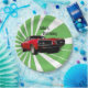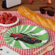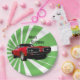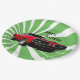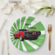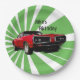 Roter Muskelwagen vor einem dynamischen Hintergrund von grünen Strahlen Papier Teller.