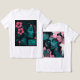 Composición más expresiva y abstracta: rostro femenino con contrastes bicolor, trazos fluidos, manchas y líneas que generan movimiento y profundidad. La flor central actúa como sello botánico de la colección, manteniendo la estética neon teal & pink para una línea uniforme en cojines, sudaderas y pósters.
