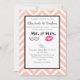 Eine moderne Hochzeitseinladung mit rosa Kissenlippen und einer Retro-mustache-Illustration. Set auf einem pfirsichfarbenen Zickzack Hintergrund. Personalisieren Sie Ihre Hochzeitsdetails.