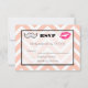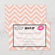 Eine RSVP-Karte mit einer modernen Abbildung mit rosa Glam Kissy Lips und einem Retro-Look Schnurrbart. Set auf einem pfirsichfarbenen Zickzack Hintergrund.