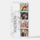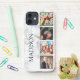 Erstellen Sie Ihre eigene personalisierte 4-Foto-Collage-Handy-Hülle mit Ihren individuellen Bildern und Namen auf einem eleganten, weißen Marmorhintergrund.