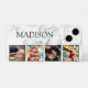 Erstellen Sie Ihre eigene personalisierte 4-Foto-Collage-Handy-Hülle mit Ihren individuellen Bildern und Namen auf einem eleganten, weißen Marmorhintergrund.
