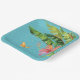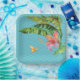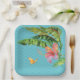 Hawaiianisches Luau oder tropisches Party, diese Teller sind einfach elegant, mit einem marinblauen Skallopiermuster im Hintergrund, einer hübsch rosa Aquarellfarben-Hibiskus-Blume, dunkelgrünen Palmen-Blätter und einem glücklichen gelben Schmetterling.