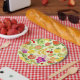 Doodles aus verschiedenen Früchten: Äpfel, Avocados, Bananen, Kirschen, Trauben, Kiwi, Zitronen, Limonen, Limetten, Birnen, Ananas und Wassermelonen.