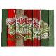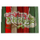 Schönes, einzigartiges, klassisches, trendiges, hübsches und dekoratives Weihnachtslabel mit einem klassischen, dunkelroten Holiday, Waldgrün und weißem Zitattext "Frohe Weihnachten" auf einem rustikalen, verwitterten Hütte Bauernhaus Stil Plane Hintergrund.
