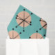 Das Fun Retro-Muster zeigt schwarze atomare Sterne aus der Mitte des Jahrhunderts, die auf rosa Diskette mit hellblauem Hintergrund grafisch dargestellt sind