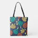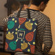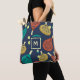 Diese Tasche ist fertig, um nach Ihren Wünschen angepasst zu werden und bietet ein Muster von Pdel-Tennisschläger und Kugeln in den Tönen Terracotta, Gold, aquamarin, gelb und creme vor einem marineblauen Hintergrund.