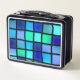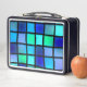 Diese Lunchbox hat ein blaues Boxmuster darauf.
