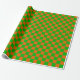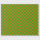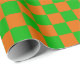 Ein farbenfroh grünes und orangefarbenes Schachbrett, gemustertes Packpapier.