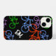 Hier ist ein lustiger Fall, dass jeder Fahrradfahrer Liebe würde! Die roten, blauen, lila und grünen Fahrräder sind auf einem schwarzen Hintergrund verstreut. Ihre zweistellige Monografie fällt in Weiß auf.