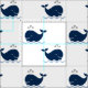 Niedliche und fröhliche schwimmende Blauwale mit grauem, herzförmigen Wasserspritzen und babyblauen Ozeanwellen. Die weiße Hintergrundfarbe kann geändert werden.