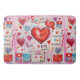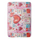 Eine Badematte mit einem skurrilen Muster. Scrapbook Stil Doodles und Skripte. Rote und rosa Herzen und verschiedene Briefe und Umschläge verstreut herum.