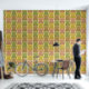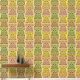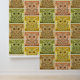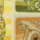 Das Design umfasst eine stilisierte Eule mit großen, kreisförmigen Augen. Der Körper der Eule besteht aus blumigen und kreisförmigen Motiven, die einen dekorativen Effekt erzeugen. Die Farbpalette umfasst warme Brauntöne, Gold, Beige und dezente, sanfte Rosatöne. Dieses Kunstwerk verbindet Natur und Geometrie nahtlos mit einem gestreiften Hintergrund, der zwischen olivgrünem und hellerem Grün wechselt.
