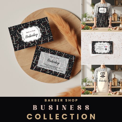 Ein kühnes, vintage Friseursalon-Design mit einem klassischen Muster aus Friseurstangen, Scheren, Rasiermessern, Kämmen und Pflegemitteln vor einem tiefen Kohlehintergrund. Der detaillierte Illustrationsstil schafft eine zeitlose Friseursalon-Ästhetik mit subtilen roten, blauen und metallischen Akzenten, die sofort die traditionelle Pflegekultur hervorrufen. In der Mitte bietet ein raffinierter ornamentaler Rahmen Platz für einen Geschäftsnamen und Kontaktdaten, während das Design sauber und professionell bleibt. Perfekt für Friseure, Pflegestudios und klassische Herrenfriseure, die eine starke, unvergessliche Markenpräsenz wünschen.